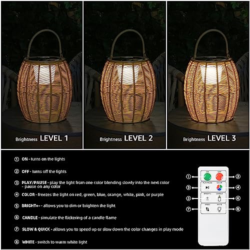 ◆ 【4 modalità Dimming】: lanterna solare da esterno rattan Dimming tramite il pulsante in basso o il telecomando. Luce bianca calda 30%/60/100% e modalità di cambio colore RGB, perfetta per patio estivo, balcone o giardino d'inverno!