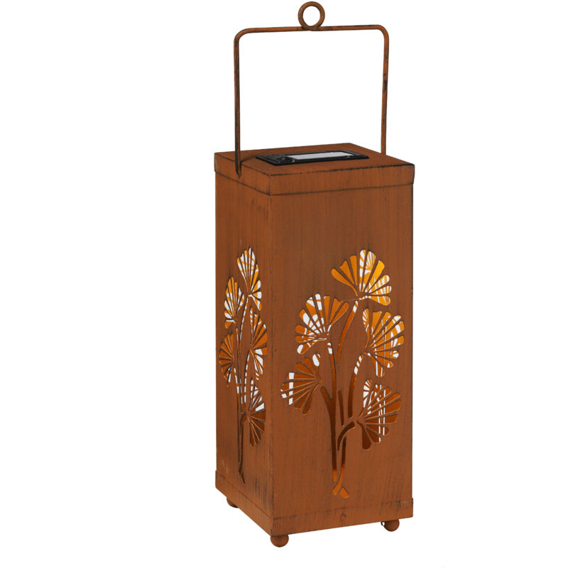 Lanterna solare a LED effetto ruggine - 27 cm - Lampada decorativa da giardino in metallo Lanterna ombra a LED ad energia solare di circa 27 cm in effetto ruggine con motivo Ginko Dati articolo: La dimensione è di circa 27 cm x 11 cm x 11 cm (altezza x larghezza x profondità) Materiale: metallo Colore: marrone (aspetto ruggine) Lanterna ombra con motivo Ginko fustellato crea un'atmosfera accogliente sul balcone, sulla terrazza o in giardino Alimentazione solare - inclusa 1x batteria Mignon AA HR6 1,2 V (sostituibile) Illuminato con 1 LED in bianco freddo Interruttore ON/OFF in alto accanto al modulo solare Maniglia per il trasporto con occhiello: perfetta per stare in piedi o appendere Fornitura: 1x lanterna ombra solare a LED