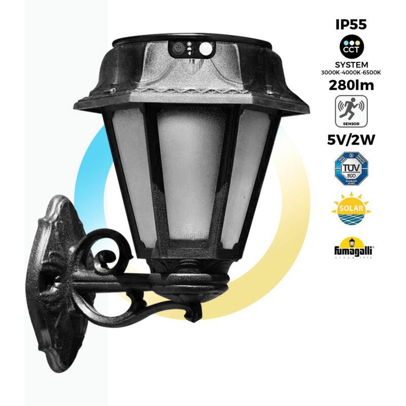 Lanterna solare a parete da giardino dell'azienda italiana FUMAGALLI con design classico, sensore di movimento e batteria sostituibile. È realizzata in resina resistente agli urti, alla corrosione e alla degradazione da parte dei raggi UV. Adatto per l'installazione a parete. Incorpora il sistema CCT che consente di regolare la temperatura di colore tra bianco caldo, bianco freddo e bianco neutro. Dispone inoltre di 3 modalità di funzionamento: modalità estiva, modalità invernale e modalità sensore. È un apparecchio di Classe III con protezione IP55. Disponibile in nero.