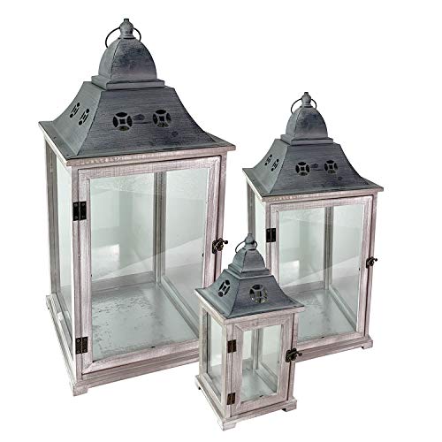 Set di 3 lanterne da giardino in legno anticato bianco spazzolato, stile shabby bianco, altezza 36/49/68 cm