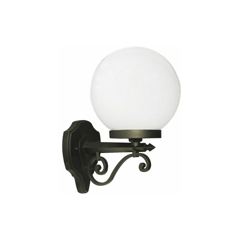 In alluminio pressofuso nero e globo in metacrilato opaco. Attacco E27-IP44. Dimensioni Ø20x26xH33 cm.