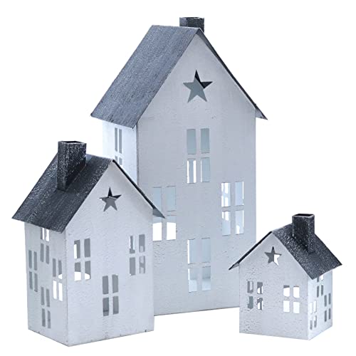 Set di 3 lanterne in metallo, 36 / 23 / 14 cm, colore bianco, lanterna decorativa a forma di casa, con stella, portacandele per interni ed esterni