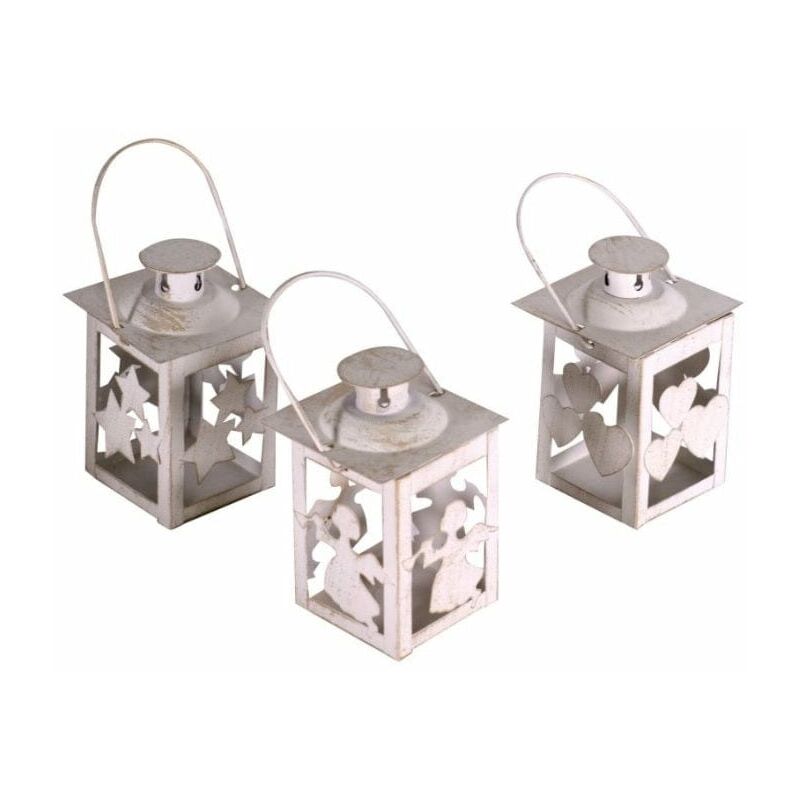Confezione con 3 mini lanterne in metallo da appendere o da appoggio per decorare e rendere accoglienti gli angolini della casa nel periodo natalizio. Motivi: Angioletti - Cuori - Stelle Colore: Crema stile shabby Dimensioni: 7.5 x 7.5 cm x 11 h cm Idea regalo natalizia