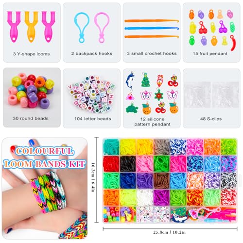 Kit Braccialetti fai da te Bambina: puoi ottenere circa 2500+ elastici, incluse scatole portaoggetti da 40 scomparti, 1 etichetta prodotto, 2 ganci, 3 piccoli uncinetti, 3 telai a forma di Y, 12 ciondoli a forma di cartone animato, 15 perline di frutta, 30 perline a botte, 48 clip per fasce da telaio, 104 perline con lettere. Una varietà di accessori nel kit per braccialetti può soddisfare le tue esigenze fai-da-te.