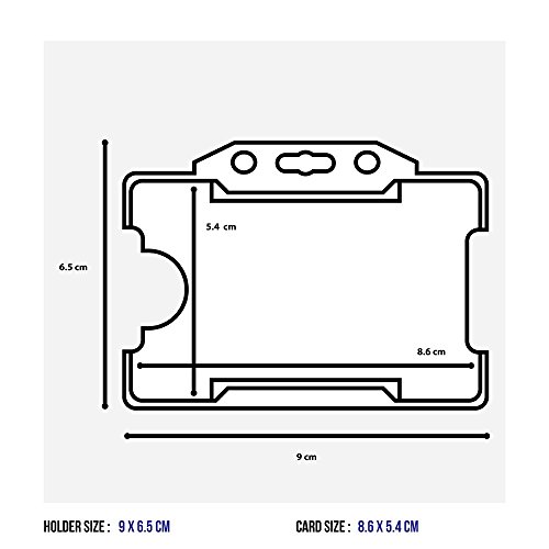 Dimensioni porta badge. Dimensioni esterne: 9 x 6,5 cm. Dimensioni interne: 8,6 x 5,4 cm (dimensioni massime inserto), adatto per carte di credito standard. Inserti non inclusi