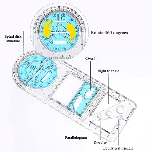 ✔️ 【Righello da disegno multifunzione】La scala di misurazione multifunzione può essere utilizzata come scala goniometro,bobina a y,fessura per il disegno di funzioni,foro circolare con segno del raggio, bobina x,foro poligonale,arco di cerchio,fessura per filo trafilato,righello corto attivo,parallelogramma,righello triangolare incorporato,foro ovale,righello,ecc.