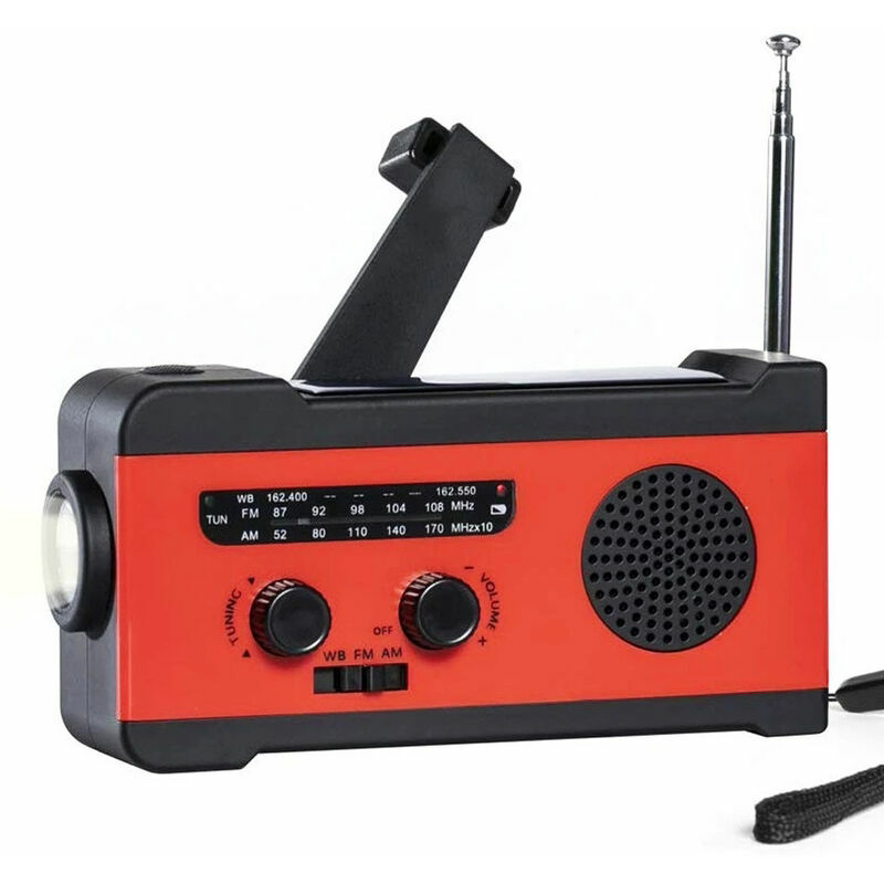 emergenza. [Ricarica multipla Metodi] Ha energia solare, alimentazione a manovella, 3 batterie AAA alimentate e cavo ricaricabile USB a 4 vie. Non importa dove ti trovi e per quanto tempo, puoi sempre accendere la radio per un minuto o due e utilizzare le funzioni della radio! [Batteria portatile] Il power bank da 2000 mAh può essere utilizzato per caricare il cellulare o altri dispositivi USB, non preoccuparti dei problemi di alimentazione. [Funzioni di illuminazione e allarme] La radio è dotata di una torcia a LED da 1 W e funzione flash SOS In caso di emergenza, tieni premuto l'interruttore per 3-5 secondi per attivare la funzione flash di allarme. [Leggero e portatile] La radio di emergenza a energia solare di dimensioni compatte è facile da trasportare come kit di emergenza per viaggiare, accamparsi e