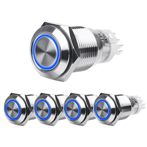 Larcele Impermeabile Autobloccante Interruttore Non-Momentaneo Metallo Mini Spingere Pulsante Interruttore con Indicatore Luce,5 pezzi,16mm JSANKG-02(Lume Blu)