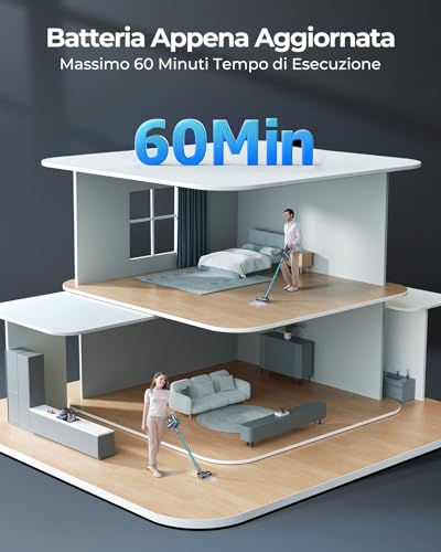 【Fino a 60 minuti di autonomia】 Rompendo la tradizionale batteria da 2200, questa batteria a vuoto viene aggiornata alla batteria da 7 * 2800 mAh. Le 3 modalità Eco (60 Mins/33KPa), Standard (35 Mins/22KPa) e Max (23 Mins/15KPa) possono soddisfare le diverse esigenze di pulizia. Ti permette di pulire tutta la casa in una volta sola. Questo scopa elettrica senza fili ricaricabile richiede solo 4-5 ore per caricarsi completamente