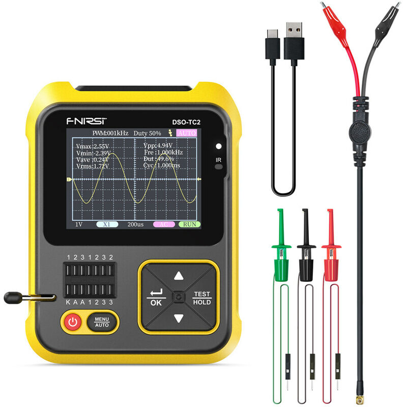 Questo prodotto integra ingegnosamente oscilloscopio digitale, tester di componenti elettronici, generatore di segnali PWM e altre funzioni in uno. Dotato di display TFT a matrice di punti a colori di grandi dimensioni. Batteria al litio ricaricabile incorporata. Porta funzioni più pratiche agli utenti con dimensioni ridotte. Se sei interessato a questo prodotto, vieni a provarlo, non ti deluderà. Caratteristiche: Funzione 2 in 1: questo prodotto integra ingegnosamente oscilloscopio digitale, tester di componenti elettronici, generatore di segnale PWM e altre funzioni in uno. Questo prodotto è particolarmente adatto per l'accoppiamento rapido di transistor, l'identificazione di componenti misti a montaggio superficiale e senza parole e lo screening preliminare di componenti di piccoli lotti. L'oscilloscopio ha un frequenza di campionamento in tempo reale di 2,5 MS/s e larghezza di banda di 200 kHz. Con la funzione di trigger completa (singolo, normale, automatico), può essere