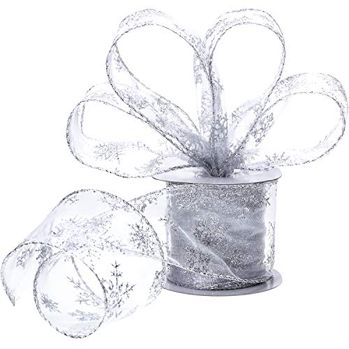 6.3 cm in Larghezza Nastro di Organza Nastro Glitterato a Filo Metallico con Fiocco di Neve con Bobina per Decorazione Natalizia, Confezioni Regalo, Decorazioni per Feste (Argento, 10 m)
