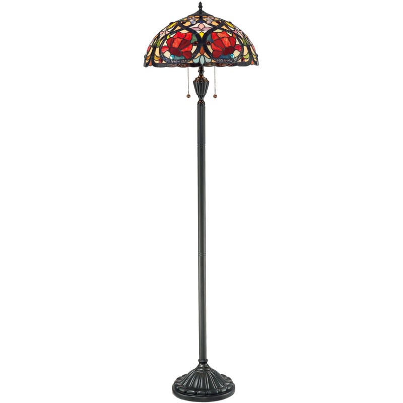 Collezione Larissa MOTIVO ART NOUVEAU Lampada da terra a 2 luci. Questa splendida collezione in stile Tiffany è caratterizzata da un paralume in vero vetro artistico lavorato a mano e realizzato in ricche tonalità gioiello e in tenui toni pastello. Il vetro è disposto in un classico motivo Art Nouveau. La tavolozza di colori caldi crea un armonioso equilibrio di luce e la base complementare è rifinita in bronzo vintage.