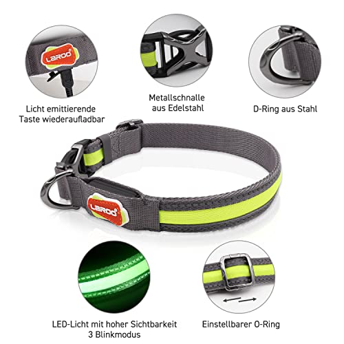 LaRoo Collare luminoso a LED per cani, ricaricabile, USB, in nylon, robusta fibbia in metallo in acciaio inox, regolabile, per cani di grossa taglia, lunghezza 2,5 x (43 - 64) cm