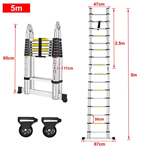 LARS360 500cm Scala Telescopica Pieghevole Scala Estraibile 14 Gradini Doppio Lato 2.5m + 2.5m Scala Multiuso in Alluminio, Scala Pieghevole Antiscivolo per Uso Domestico e Bricolage, Capacità 150kg