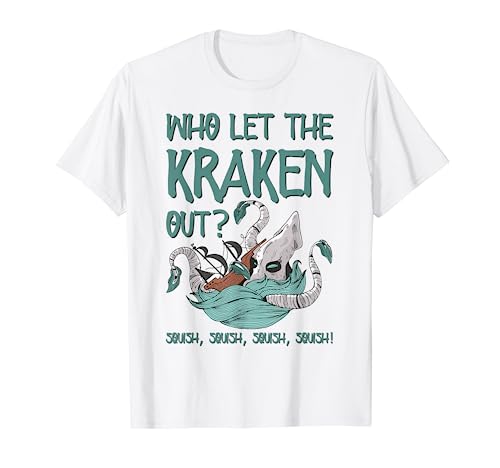 Qualcuno ha rilasciato il Kraken? Raffreddare design del mare con un mostro Kraken che schiaccia una nave nel mare e "Chi lascia uscire il Kraken? Squish, Squish, Squish, Squish, Squish!" didascalia.