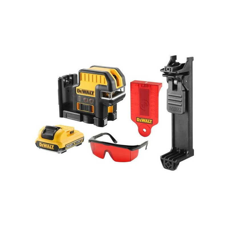 DeWalt - Livella laser a croce rossa da 10,8V - DCE0822D1R I vantaggi di questa livella laser DeWalt DCE0822D1R sono: - Un robusto laser a linee incrociate che combina 2 linee incrociate selezionabili (orizzontale e verticale) + 2 faretti indipendenti con funzione a piombo. - Include un supporto magnetico integrato. Ideale per tutte le applicazioni di livellamento e i lavori di trasferimento da pavimento a soffitto. Specifiche della livella laser DeWalt DCE0822D1R: Tipo: 2 linee trasversali orizzontali e verticali, 2 piombini indipendenti Tipo di livellamento: autolivellante Classe laser: 2 Precisione (punto): 0,2 mm / m Precisione (linea): 0,3 mm / m Gamma di compensazione: ± 4 Tempo di livellamento: ≤ 3 s Campo di lavoro: 15 m (linea) / 30 m (punto) Filettatura per adattatore da 1/4 Campo di lavoro con rilevatore 60 m Batterie (alcaline se non diversamente specificato) 10,8 V (incluse) Durata della batteria (tutti i laser accesi): 10 ore Temperatura di funzionamento: -10° C> 50° C