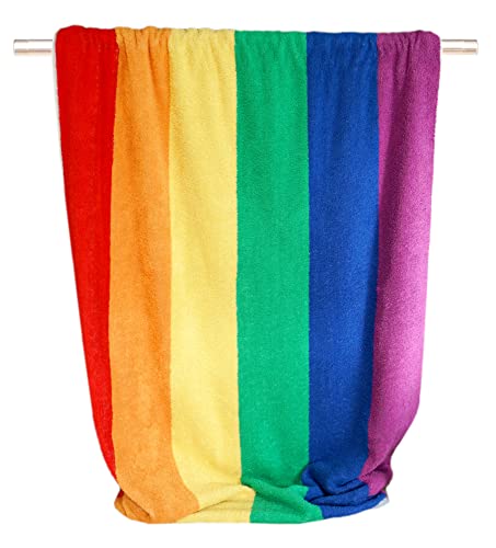 L'effetto asciugamano è il botto! Questo telo da spiaggia di alta qualità dona un tocco luminoso a strisce arcobaleno in rosso, arancione, giallo, verde, blu e viola.