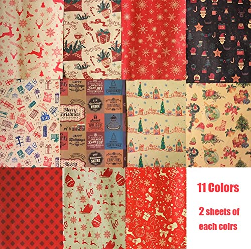 LATERN 22 Fogli Carta Da Regalo Natalizia, 70cm x 50cm Carte Da Regalo Kraft Riciclate Calze Natalizie Con Fiocco Di Neve Alce Albero Di Natale Modello Fogli Di Carta per Confezioni Regalo (11 Colori)
