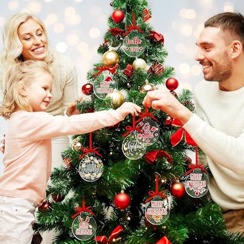LATERN 60 Pezzi Pallina di Natale Ornamenti a Disco in Acrilico Trasparente, 10CM Girare Palline Piatte Vuote in Acrilico con Fori e Nastro Rosso per L'albero di Natale Festa Sospeso Decorazione