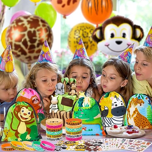 Regali Festa di Safari Compleanno Bambino - 12 borse con coulisse di grande capacità, 12 braccialetti in silicone con strisce di animali, 12 portachiavi della giungla, 12 adesivi per tatuaggi. Perfetto per riempire la pinata della borsa della festa di compleanno a tema animale selvatico, per bambini ragazzi, riempitivi per pinata per borse da festa di compleanno a tema animali selvatici.