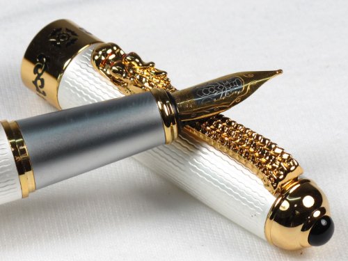 Lattest Mother of Pearl White Fountain Pen Golden Dragon Ruby Eye Noblest with Push in Style Ink Converter