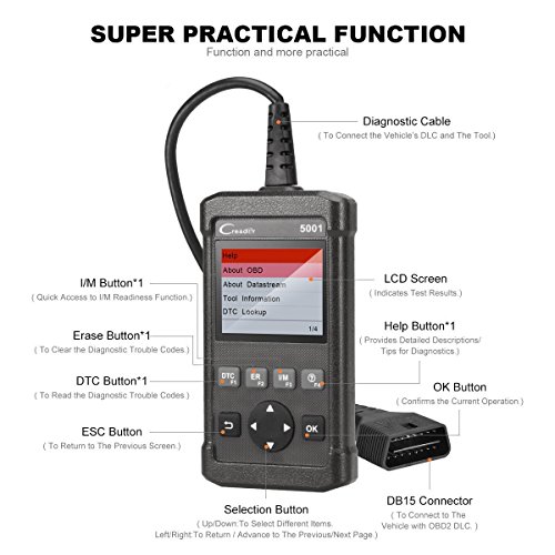 Scanner OBDII funzione completa: il lettore di codice OBD2 creader Launch CReader 5001 offre tutte le funzioni di diagnostica OBD EOBD. Funziona su veicoli compatibili OBDII, costruiti a partire dal 2002 (fino ad oggi). Anche se è compatibile con OBDII auto a partire dal 2002, alcune autovetture hanno design speciale, quindi determinate funzioni potrebbero non essere compatibili con alcune automobili.