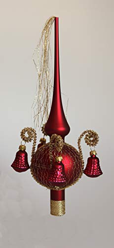Lauschaer - Puntale per Albero di Natale in Vetro, con Campanelle, Rosso Scuro Opaco L ca. 28 cm d(Sfera) 7 cm Decorazione per Albero di Natale in Vetro soffiato, Decorato a Mano, Filo Leonischer