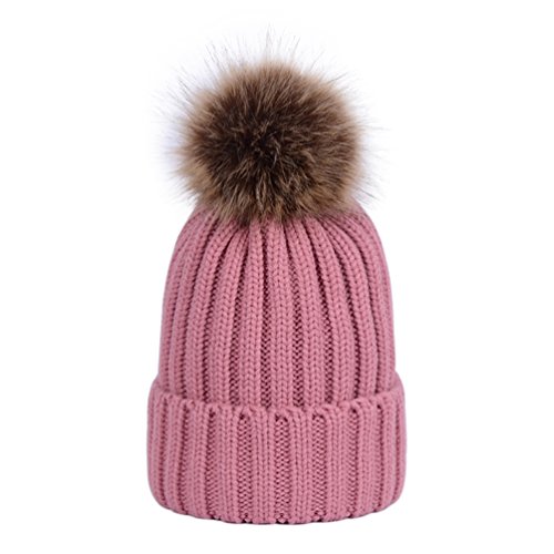LAUSONS Cappelli Lavorato a Maglia Donna, Berretto a Coste Invernali con Pompon in Pelliccia Sintetica Rimovibile Rose Foncé