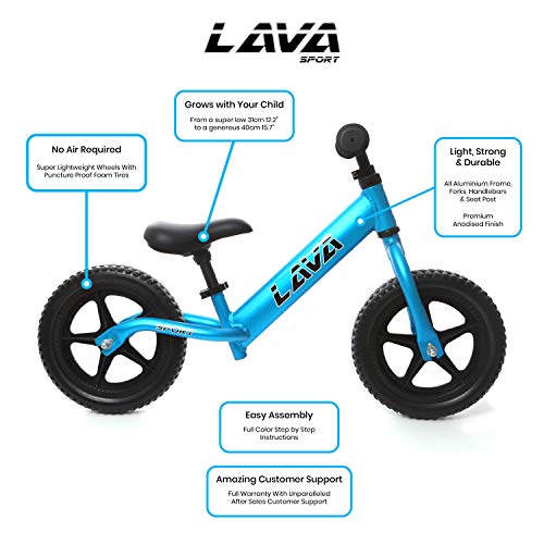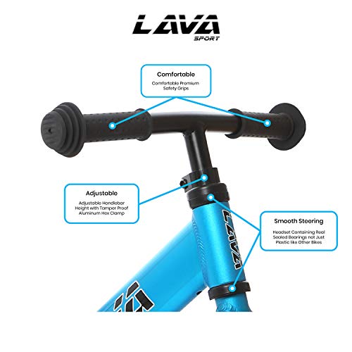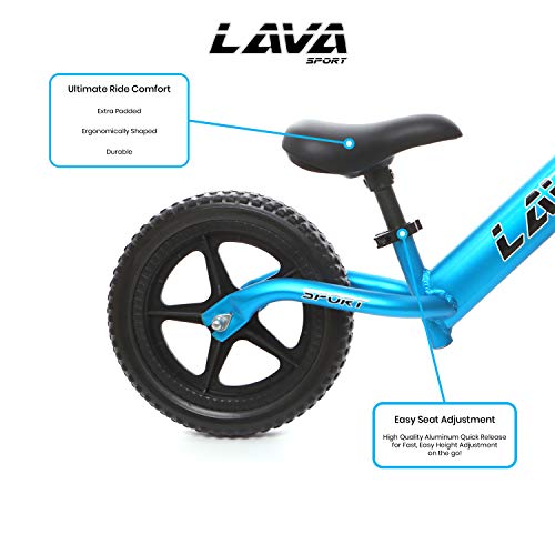 LAVA SPORT - Bike di allenamento leggero per bambini per ragazzi e ragazze e ragazze di 2, 3 e 5 anni - Senza pedale per bambini con manubrio e sedile regolabili - alluminio, pneumatici Eva - Blu