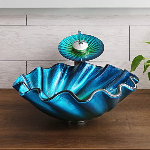Lavabo in Vetro temperato Lavabo da appoggio a Forma di Foglia di Loto con Rubinetto a Cascata e Scarico Combinato Lavabo da Bagno Lavandino,A