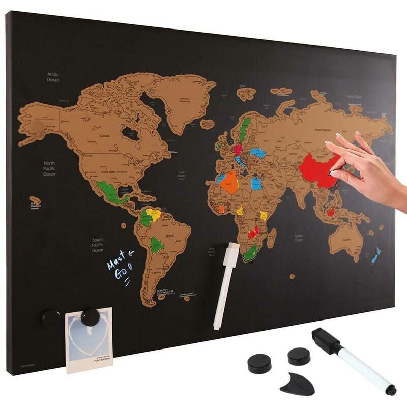 Ricorda i tuoi viaggi per il mondo donando un tocco di stile alla tua casa con la nuovissima lavagna magnetica con mappamondo da grattare di Bakaji! Ogni stato che compone questo bellissimo mappamondo su lavagna può essere grattato, permettendoti di evidenziare con colori diversi tutte le città e nazioni che hai visitato durante i tuoi viaggi, inoltre con il pratico pennarello bianco cancellabile incluso nella confezione potrai scrivere e decorare il tuo planisfero con frasi da ricordare mete da voler visitare ecc... La lavagna ha una dimensione di 60 x 40 cm e può essere facilmente installato alla parete grazie ai pratici ganci sul retro. Design moderno e minimale con lavagna in colore nero e stati in colore beige che si adatta perfettamente a qualsiasi tipo di arredamento sia esso moderno o classico. All'interno della confezione oltre al pennarello cancellabile è presente anche un accessorio per grattare i vari stati da te visitati e 2 magneti per attaccare foto note e tutto ciò che