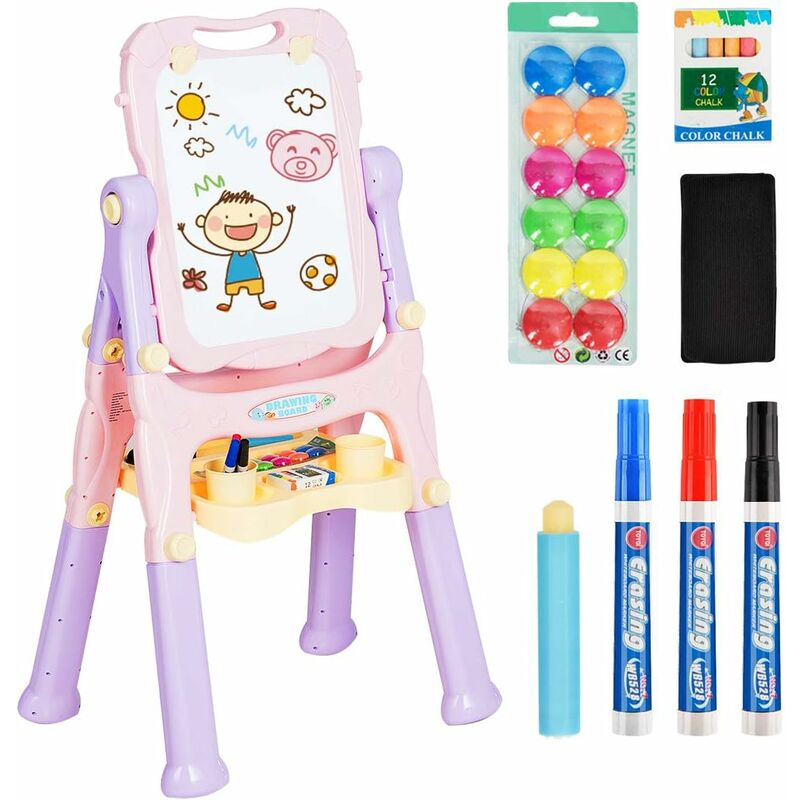 INFORMAZIONI Materiale sicuro e durevole: Il nostro cavalletto magnetico per bambini double face è realizzato in PP di alta qualità e ha superato la rigorosa certificazione di sicurezza, è molto durevole, leggero ed ecologico. Il materiale atossico e non irritante protegge la sicurezza del bambino. La struttura a triangolo offre la stabilità affidabile. Altezza regolabile: Il nostro cavalletto verticale double face per bambini è dotato di piedini del cavalletto lunghi e corti. L'altezza regolabile è adatta ai bambini in crescita di diverse età. Allo stesso tempo, l'altezza regolabile può soddisfare le diverse esigenze per dipingere in diverse pose. Lavagna double face: La nostra lavagna girabile include la nera lavagna classica e la lavagna bianca magnetica. Tutte sono facili da pulire con il cancellino. Il design girevole a 360° può permettere al tuo bambino di usare la lavagna in diversi angoli. Il design double face permette a due bambini di dipingere contemporaneamente. Grande