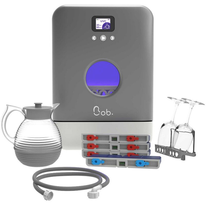 Bob BOBPACKPREMIUMSILVER Lavastoviglie di Daan Tech. Tipo di prodotto: lavastoviglie. Classe di efficienza energetica: F. Sistema di drenaggio: tubo da inserire in un lavandino o altro sistema di drenaggio dell'acqua. Numero di coperti standard: 2. Livello sonoro (dB): 43. Classe di livello sonoro: B. Contro. energia/100 cicli (kWh): 37. Contro. acqua/ciclo (L): 2,7. Durata del programma eco (h:min): 1:30. Tipo di asciugatura: Apertura automatica della porta a fine ciclo per un'asciugatura naturale. Tipo di controllo: 3 pulsanti fisici retroilluminati. Colore: argento. Serbatoio dell'acqua integrato: sì. Capacità serbatoio (L): 3,9. Avviso di fine programma: Sì (suoneria). Illuminazione: luce LED RGB multicolore. Accessori inclusi: cavo di alimentazione (1,5 m), tubo di scarico con sistema Bob Easyfix (1,5 m), 1 cestello principale, modulo per 6 piatti, 2 moduli per 2 bicchieri, modulo per posate e 1 istruzioni illustrate, 3 cassette pop + 1 cassetta rock'n'roll: 90 cicli di lavaggio