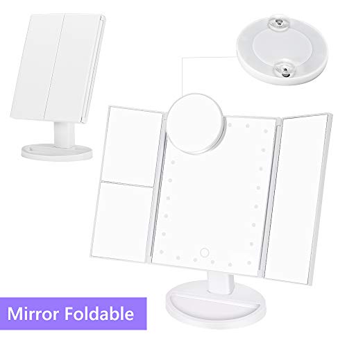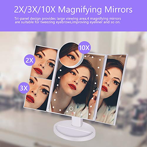 Lavcus Specchio per il Trucco Illuminato 24 Luci a LED Specchio Triplo Ingrandimento Pieghevole Specchi 1X/2X/3X/10X 180 ° Regolabili con Interruttore a Sensore Tattile (Bianca)