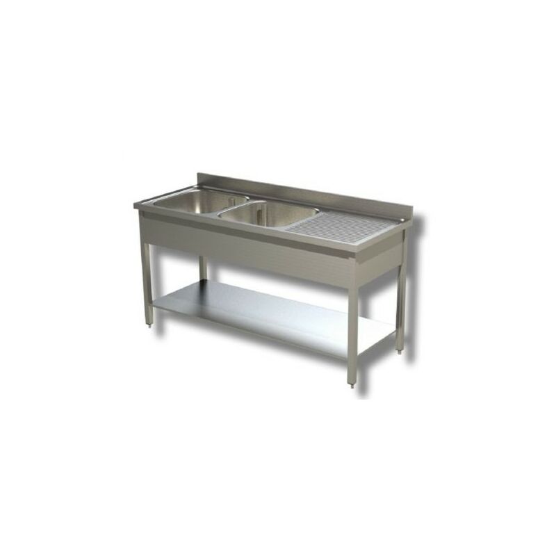 Codice RS4704 - Lavello lavatoio su gambe e piano di fondo, modello RP-DSLG2VGDX176, costruito in acciaio inox 430, dimensioni cm. 170x60x85 (lxpxh), n.2 vasche dim. cm. 50x40x30 (lxpxh), sgocciolatoio DX. Vasca stampata spessore 1 mm, piano con spessore 40 mm, alzatina posteriore spessore 20 mm e altezza 100 mm. Gambe con profilo quadrato 40x40 mm con piedini regolabili in altezza. Fornito in kit smontato. In dotazione: piletta di scarico d. 46 mm e tubo troppo pieno.