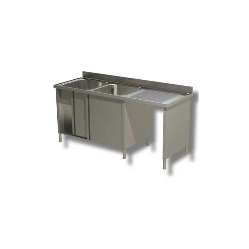 Codice RS5083 - Lavello lavatoio armadiato, modello RP-DSLA2VPDX187, costruito in acciaio inox 430, dimensioni cm. 180x70x85 (lxpxh), n.2 vasche dim. cm. 50x50x30 (lxpxh), sgocciolatoio DX, vano pattumiera, antine tamburate. Vasca stampata spessore 1 mm, piano con spessore 40 mm, alzatina posteriore spessore 20 mm e altezza 100 mm. Piedini regolabili in altezza. In dotazione: piletta di scarico d. 46 mm e tubo troppo pieno.