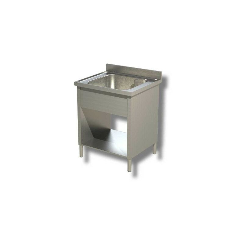 Codice RS8279 - Lavello lavatoio su fianchi e piano di fondo, modello RP-DSLF1V056, costruito in acciaio inox 18/10 AISI 304 (no 430), dimensioni cm. 50x60x85 (lxpxh), n.1 vasca dim. cm. 40x40x30 (lxpxh). Vasca stampata spessore 1 mm, piano con spessore 40 mm, alzatina posteriore spessore 20 mm e altezza 100 mm. Gambe con profilo quadrato 40x40 mm con piedini regolabili in altezza. In dotazione: piletta di scarico d. 46 mm e tubo troppo pieno.