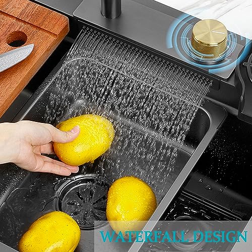 Lavello moderno a cascata: La maniglia singola può controllare la modalità di erogazione dell'acqua e la temperatura dell'acqua (calda/fredda) e il volume dell'acqua. Il design creativo della cascata semplifica la pulizia dei fanghi di frutta e verdura.Il rubinetto retrattile con 3 impostazioni di spruzzo può ampliare la gamma di pulizia per soddisfare le diverse esigenze quotidiane.