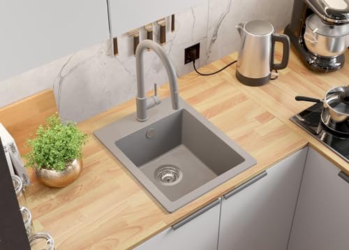 Lavello Cucina 50x50 cm, Lavandino Cucina in Granito 1 vasca + Rubinetto + Sifone Classico, Lavabo Cucina ad incasso Riga 40 XL di Primagran, Grigio