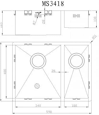 Il lavello da incasso è adatto per sottolavelli a partire da 60 cm di base. Dimensioni esterne del lavello: 544 x 444 mm, raggio: 11 mm. Dimensioni interne del lavello da incasso: 340 x 400 x 185 mm e 180 x 400 x 125 mm, raggio: 0 mm. Il lavello può anche essere installato a filo della superficie.