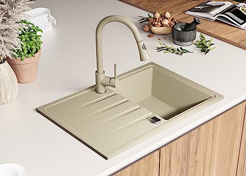 Lavello Cucina 78 x 50 cm, Lavandino Cucina Composito 1 vasca + Rubinetto + Sifone Automatico, Lavabo Cucina Incasso Milano di Primagran, Beige