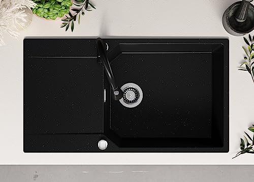 Lavello Cucina 90 x 50 cm, Lavandino Cucina in Granito 1 vasca + Rubinetto + Sifone Classico, Lavabo Cucina Incasso Madrid 900-60 XXL di Primagran, Nero Metallic