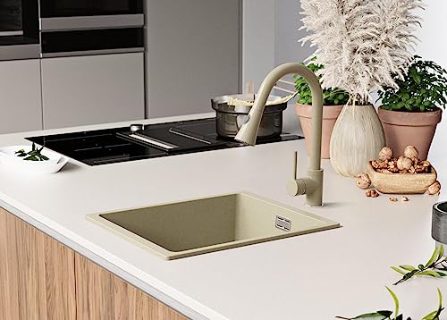Lavello Cucina 36 x 47 cm, lavello a una vasca in granito + rubinetto + sifone a scatto, lavello London 40 Slim di Primagran, beige