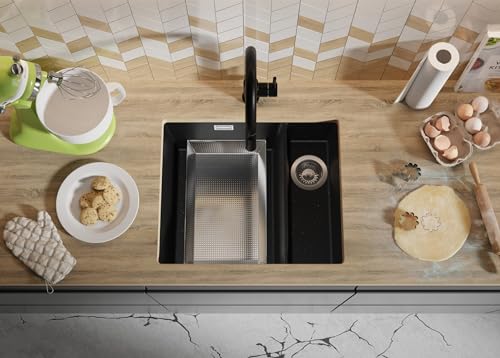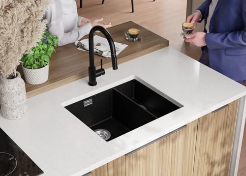 Lavello Cucina 56 x 47 cm, lavello a 2 vasche in granito + rubinetto classico + sifone, lavello London 60 Duo XL di Primagran, nero metallizzato