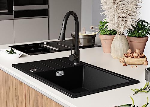 Lavello in Granito 78 x 50 cm, Lavandino Cucina 1 vasca + Sifone Pop-Up, Lavabo Cucina Incasso Copenhague 780 Cargo di Primagran, Nero
