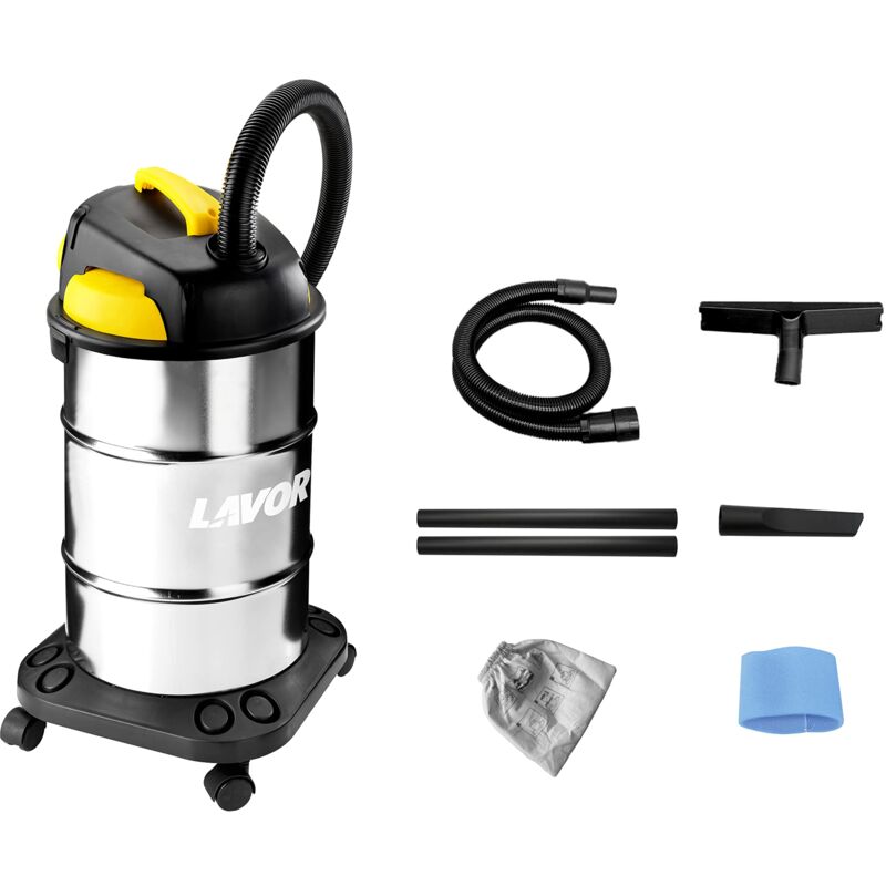 Bidone aspirasolidi e aspiraliquidi con fusto in acciaio da 30 litri, motore da 1200 Watt max, potenza di aspirazione 180 mbar, portata 30 l/s. La pratica maniglia superiore e le ruote girevoli poste sulla base carrellata portaccessori facilitano gli spostamenti del bidone, facendolo arrivare velcemente dovunque serva. Dotazione accessori completa per aspirare qualsiasi tipo di residuo secco o per aspirare liquidi. Grazie al pratico portaccessori posto alla base del bidone è possibile riporre i tubi e la bocchetta in maniera ordinata al termine della fase di aspirazione.