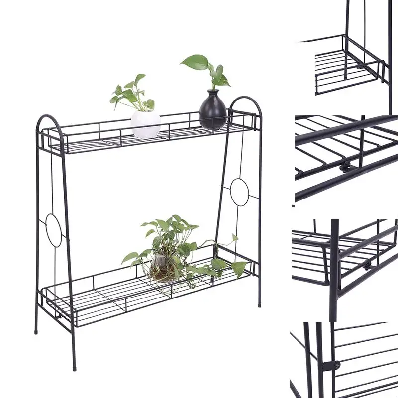 2 Layers Flower Metal Shelves Plant Pot Rectangle Stand Artwork Decoration Wrought Iron for Indoor Outdoor Garden