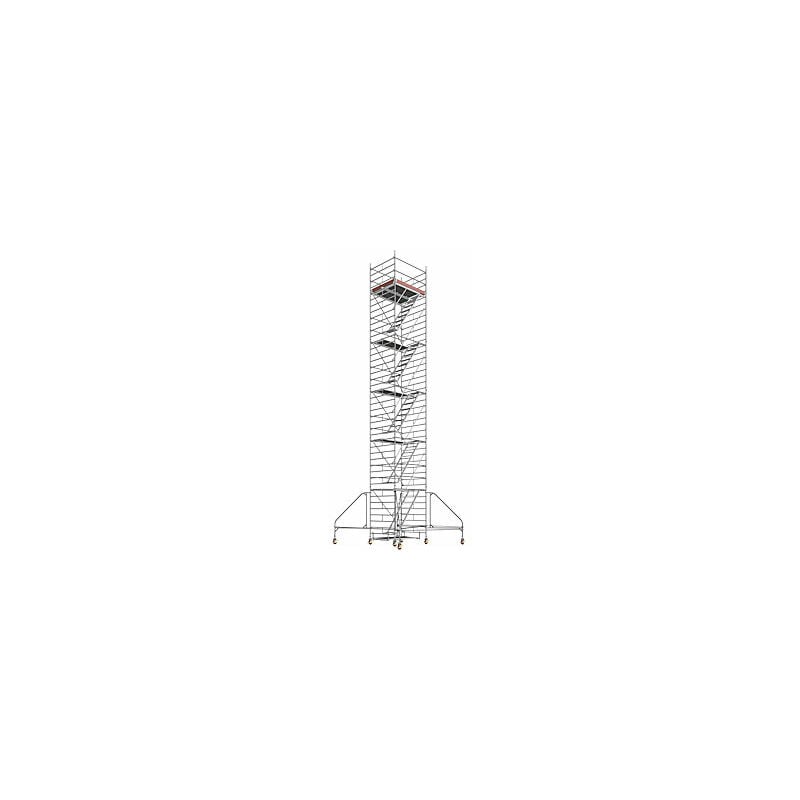 Trabattello universale, con scala, piattaforma 1,80 x 1,50 m, altezza del trabattello 11,43 m. Fornitura = smontato. Lunghezza piattaforma = 1800 mm. Altezza di lavoro = 12.2 m. Altezza di salita = 10200 mm. Altezza trabattello = 11.43 m. Peso = 528.3 kg. Materiale = alluminio. Portata = 2 kN/m². Dotazione ruote = ruota in plastica con vite filettata alla base. Diametro ruote = 200 mm. Norma = DIN EN 1004-1. Tipo di prodotto = trabattelli mobili per scale. Leggeri, robusti, durevoli. Per altezze elevate. Rotelle regolabili per la messa in piano. Sicurezza garantita dal controllo TÜV. Grande superficie d'appoggio e scala zoppa per lavorare comodamente. Il trabattello mobile in alluminio è particolarmente compatto e ideale per lavori di manutenzione. La comoda salita della scala con corrimano facilita la salita e la discesa, permette di superare facilmente grandi altezze e lascia una mano libera per trasportare attrezzi e materiale. Scala (larghezza 1,50 m) in alluminio per montaggio a