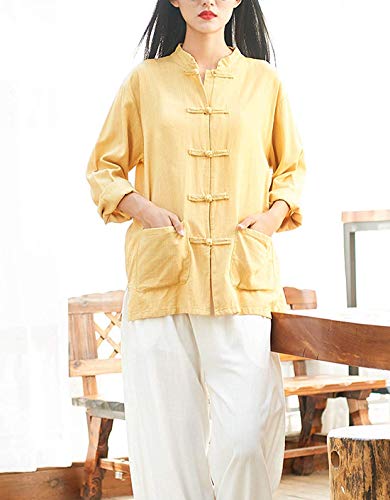 Lazutom Camicia tunica da donna in cotone e lino con bottoni a forma di rana e colletto alla coreana, per arti marziali cinesi, kung fu, tai chi, Giallo, Etichettalia unica