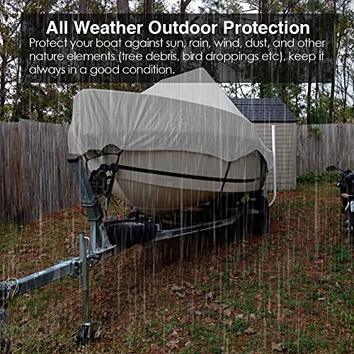 PROTEZIONE COMPLETA: Il cordino elastico attorno all'orlo inferiore garantisce una vestibilità aderente per fornire alla tua barca una protezione a 360 gradi e dotata di cinghie regolabili e fibbie a sgancio rapido che ti consentono di legare facilmente la copertura della barca alla barca ed evitare che venga spazzato via